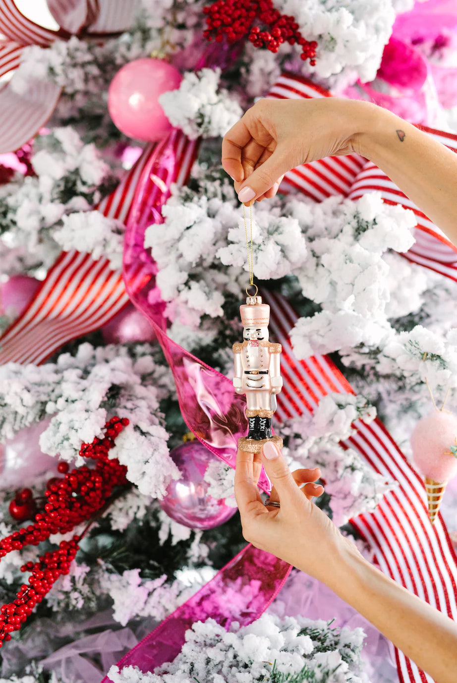 Complete the Land of Sweets look with an array of pink Nutcracker decorations and peppermint candy accents. This Pink Nutcracker Cookie Jar is the perfect vessel for a whimsical winter floral arrangement. We suggest pairing it alongside a few nutcracker figurines and candy cane candlesticks for a magically sweet centerpiece.