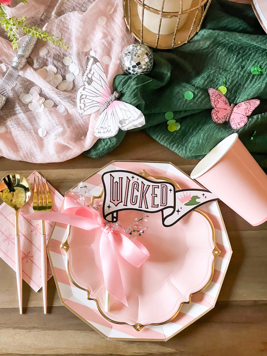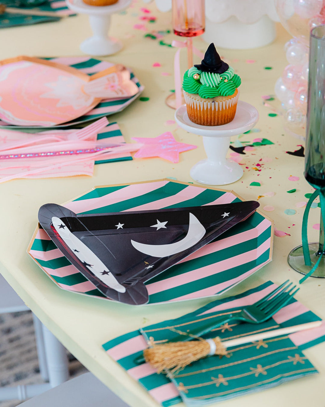 When it comes to setting the perfect Wicked party table, it’s all about mixing and matching. We recommend representing both characters in your tablescape with our Wicked-inspired party collection! Simply alternate our Pink Witch Hat Plates and Black Witch Hat Plates, layering them with our Witch Hat & Broom Large Plates and Magic Wand Guest Towels.