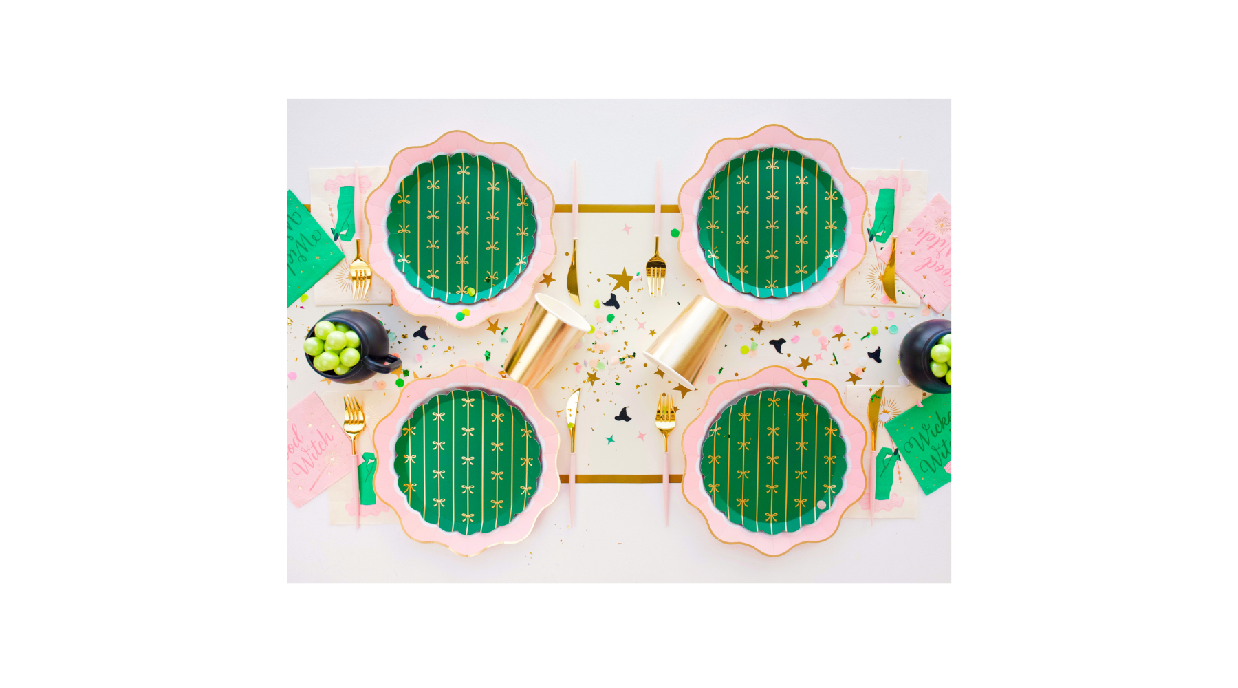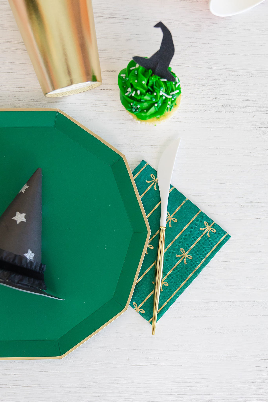 For a wonderfully wicked Elphaba place setting, use the same pieces in emerald green. The gold foil details on our Signature Emerald Green Dinner Plates, Cabana Stripe Plates, and coordinating Bow Napkins bring the perfect amount of Emerald City energy. Complete the look with our Signature Gold Cups, cutlery, and a mini witch hat. En voila– a setting so magical, it just might defy gravity!