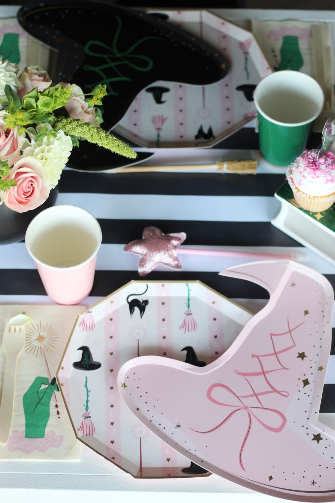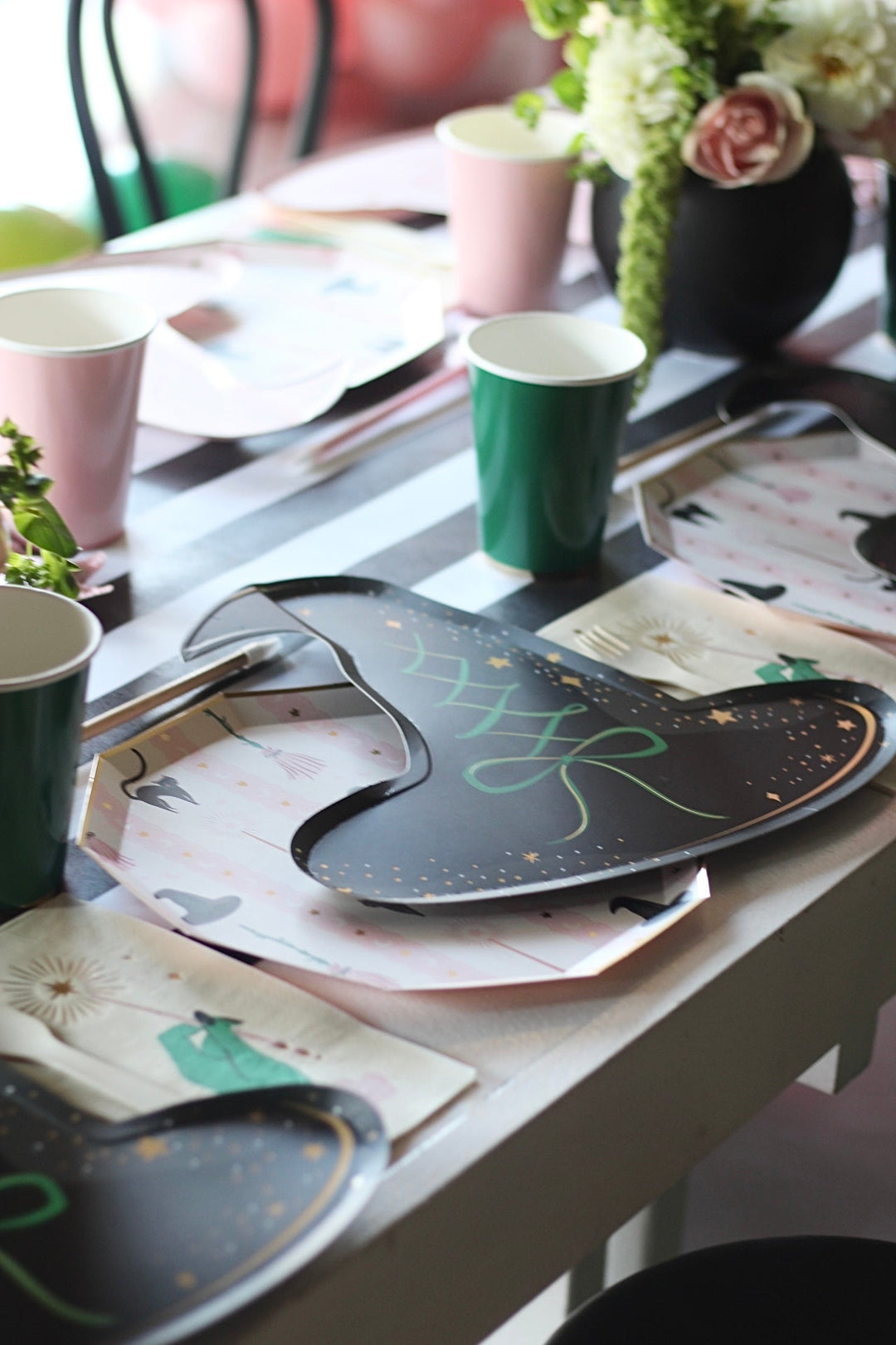 When it comes to setting the perfect Wicked party table, it’s all about mixing and matching. We recommend representing both characters in your tablescape with our Wicked-inspired party collection! Simply alternate our Pink Witch Hat Plates and Black Witch Hat Plates, layering them with our Witch Hat & Broom Large Plates and Magic Wand Guest Towels.