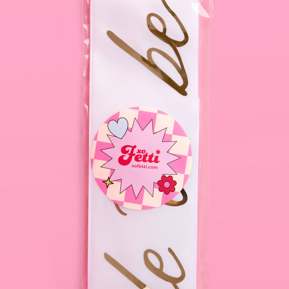 Meet your bride era essential. This Classic Bride Party Sash blends white satin and gold foil for a glow that reads in every photo. Style it for bachelorette, shower, or rehearsal and keep the spotlight on you.