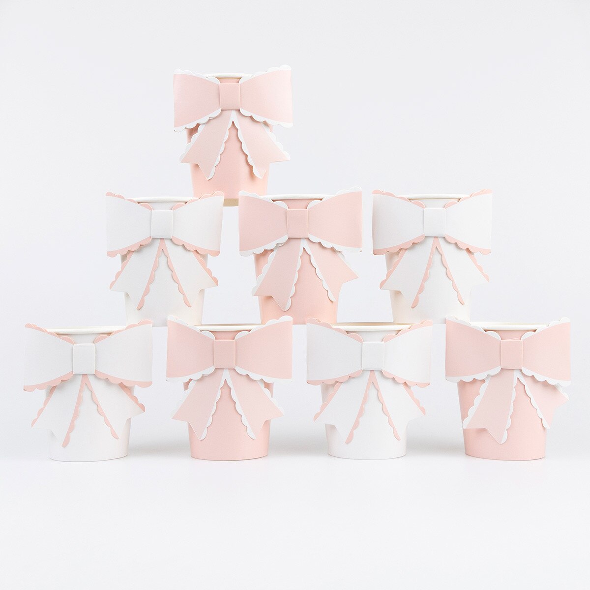 Ultra-chic and stylish, these Scalloped Bow Cups bring bow-led charm to every sip. The set includes 4 pink and 4 white paper cups, each finished with a statement bow with scalloped edging in co-ordinating tones, to tie the look together beautifully. Whether you're serving hot or cold drinks, these elegant cups are perfect for Valentine's, Galentine's gatherings, romantic dinners, anniversaries, bridal showers, princess parties or afternoon tea. Pretty, practical and party-ready.