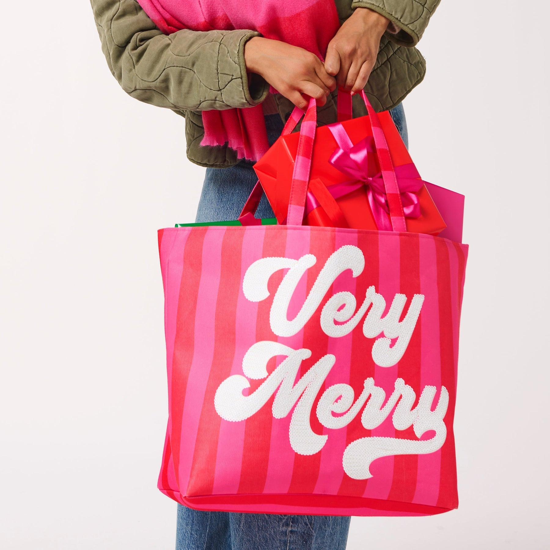 Spread holiday cheer with the "Very Merry" Gifting Tote, a bold and festive carryall that’s perfect for gifting, shopping, or hauling holiday goodies. Featuring vivid pink and red stripes with a sequin-accented “Very Merry” design, this oversized tote brings the joy of the season wherever it goes. Sturdy double shoulder straps and a snap closure keep your contents secure while you’re out and about. Whether you’re wrapping up a holiday haul or delivering presents in style, this bag is here to sleigh.