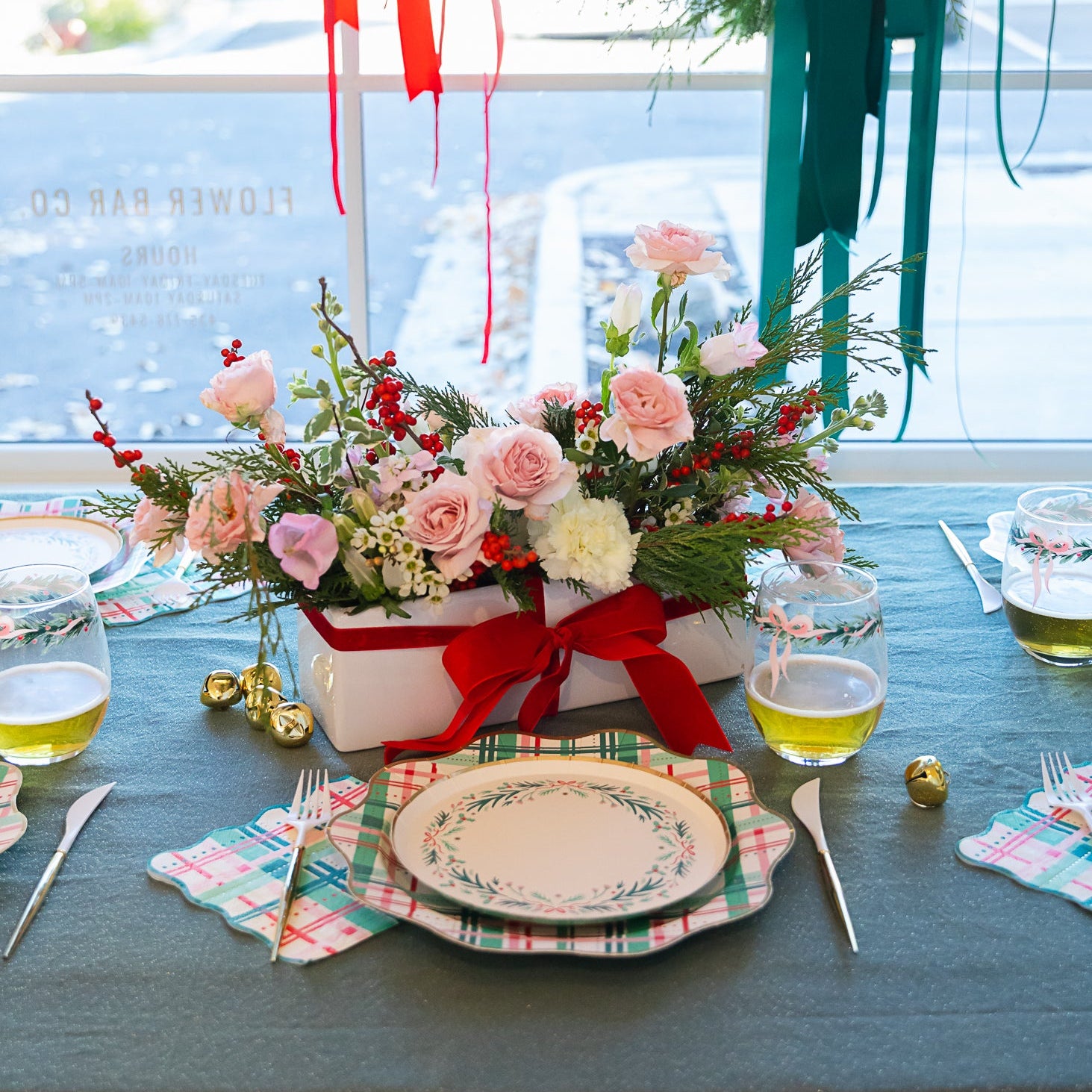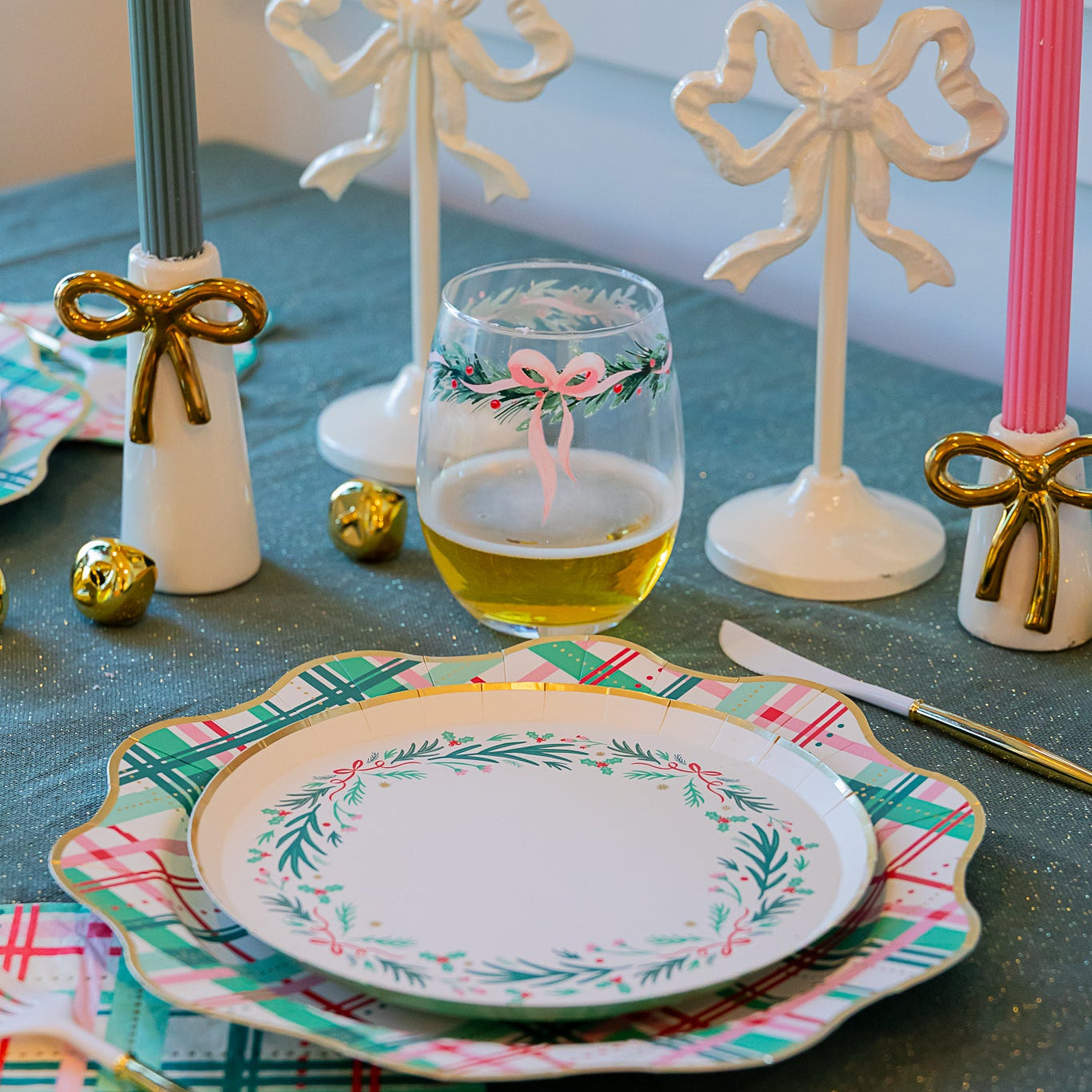 Indulge in the holiday spirit with this Holiday Garland Stemless Wine Glass! With a festive garland design and charming bows, this glass is the perfect addition to your holiday cocktail parties. Get into the season and elevate your drinkware with this must-have piece!