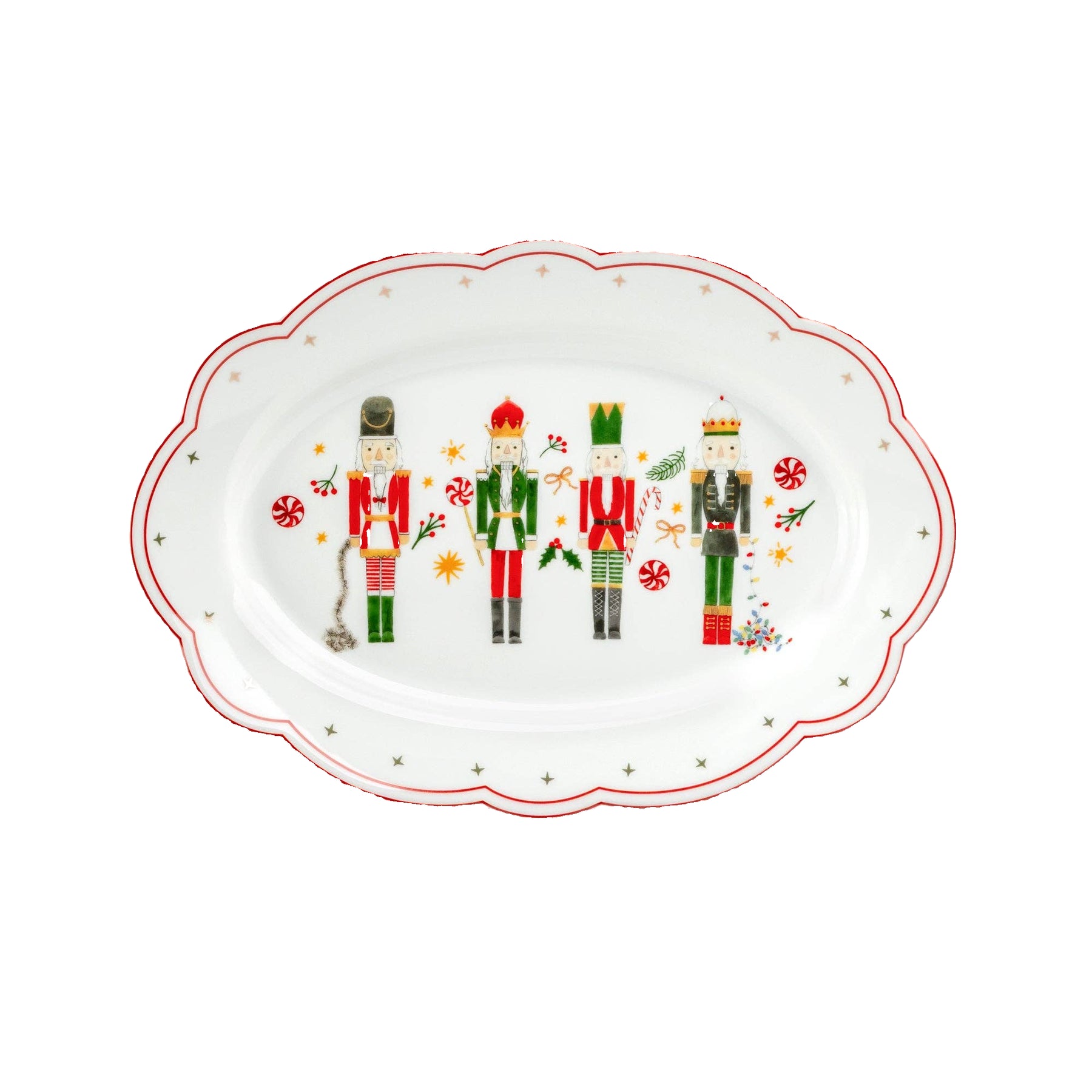 Elevate your holiday entertaining with this stunning Royal Nutcracker Serving Platter. Crafted from fine porcelain, this elegant piece combines festive charm with practical functionality, making it the perfect centerpiece for displaying appetizers, desserts, and seasonal treats. Its sophisticated nutcracker design adds a touch of timeless holiday magic to any gathering, while the durable porcelain construction ensures it becomes a cherished part of your entertaining collection year after year. Impress your guests and create memorable moments with this show-stopping serving essential.