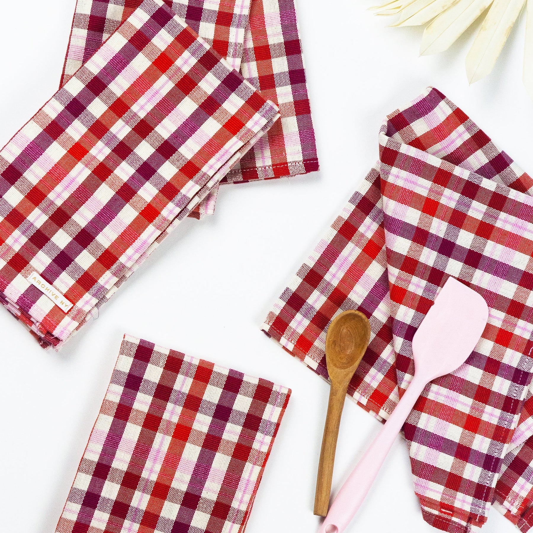 The Noel Plaid Dinner Napkin Set is the perfect accent to add color and texture to any Holiday table setting. Stripes of red currant, cranberry and light pink are woven together to create this seasonal and timeless piece. Ethically handwoven by artisans in Xela, Guatemala.