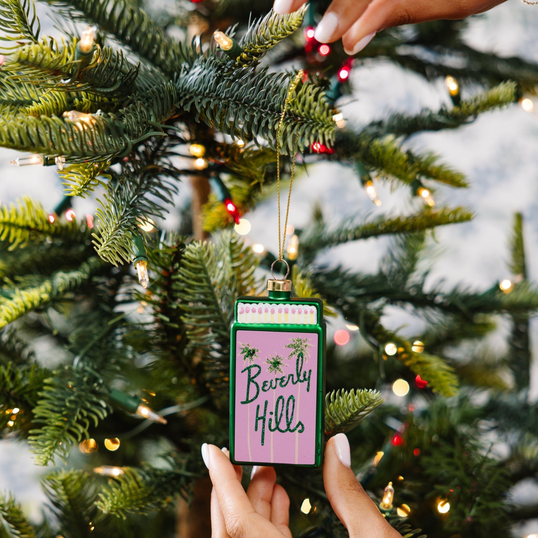 Infuse your holiday tree with a sense of wanderlust using the Beverly Hills Matchbook Ornament. This exquisite ornament features iconic hot spots from the glamorous Beverly Hills, beautifully reimagined in charming glass keepsakes. Each piece reflects the allure and elegance of this dreamy destination, making it an enchanting addition to your holiday decor. Perfect for those who love to travel or dream of sunny California, this ornament serves as a delightful reminder of adventure and luxury.