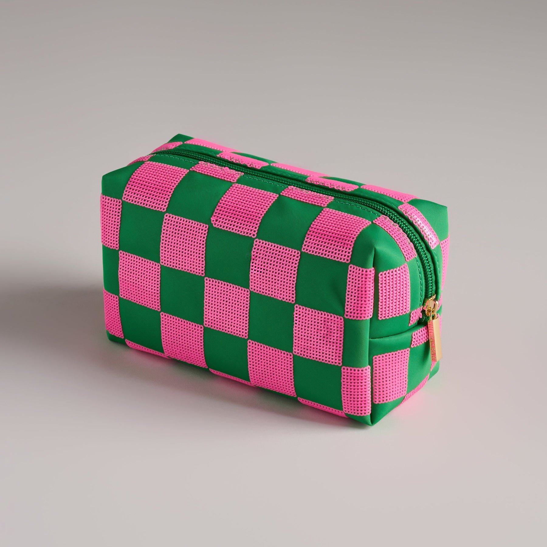 The Cara Check Pattern Zip Pouch is your new go-to for keeping things cute and contained. Featuring a bold green and pink checkerboard design with a dash of sparkle, this compact pouch brings serious personality to your purse or vanity. The zip-top closure keeps your must-haves secure, while the structured shape makes it easy to grab on the go. Perfect for stashing makeup, chargers, or whatever tiny treasures you carry. It makes a wonderful stocking stuffer or holiday gift for girls!