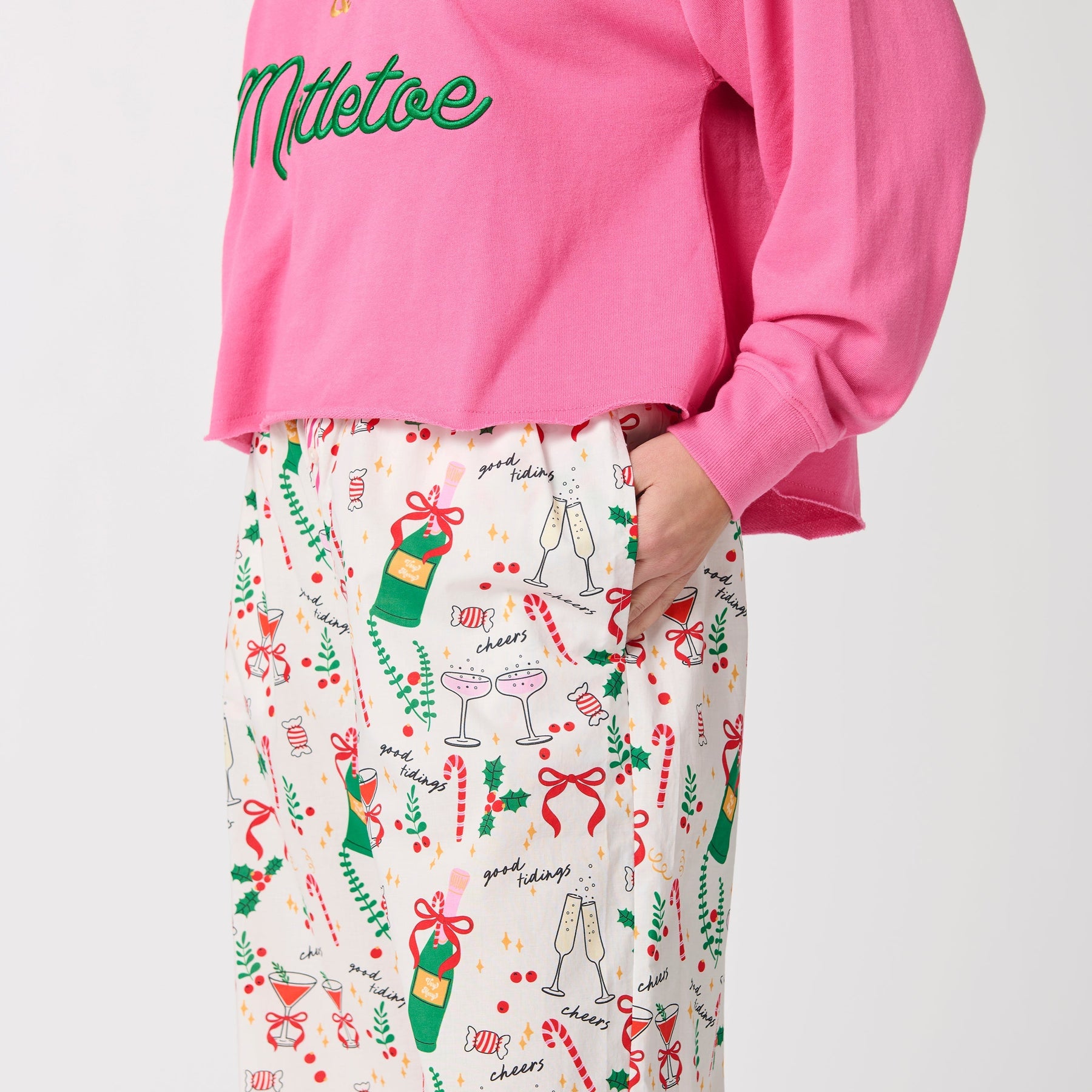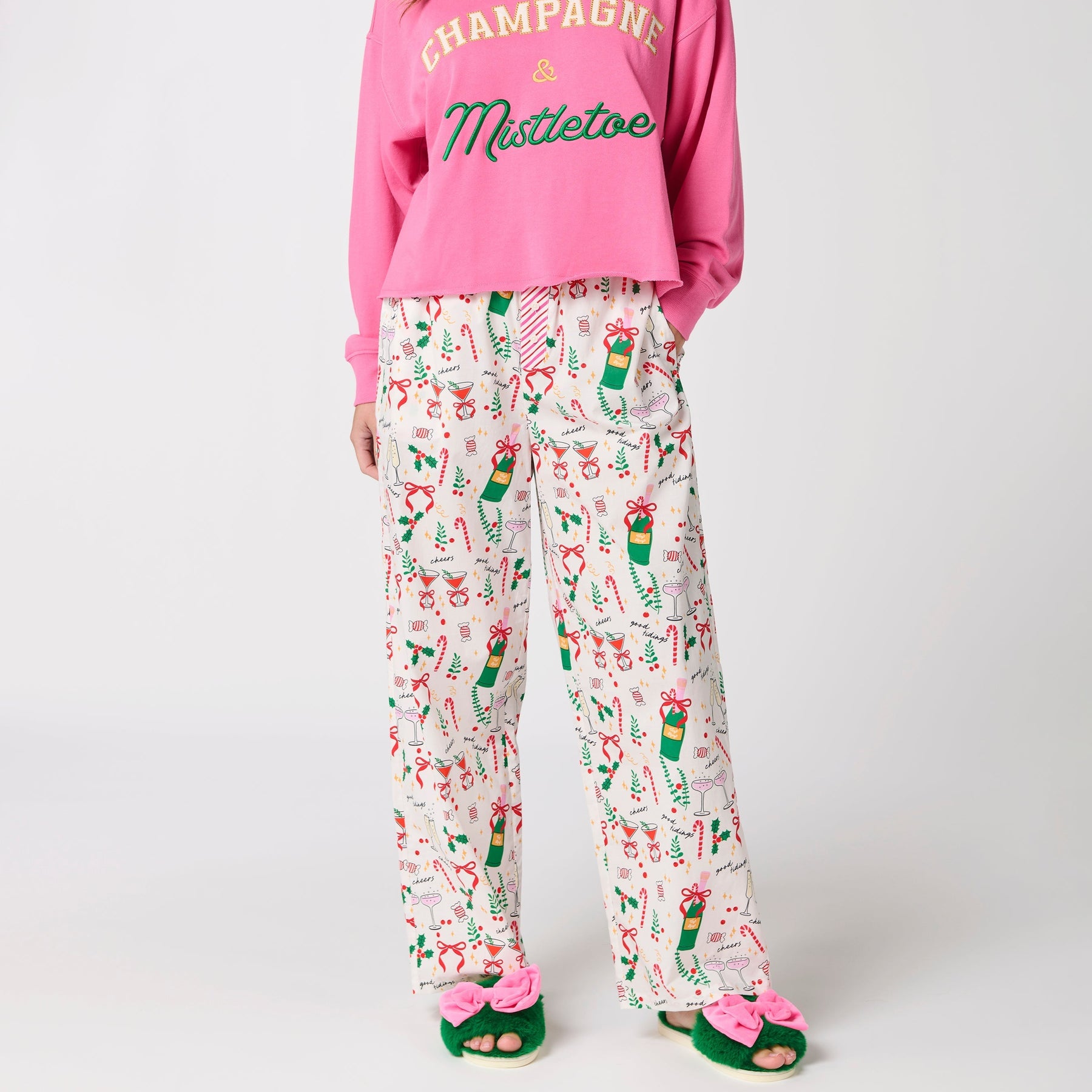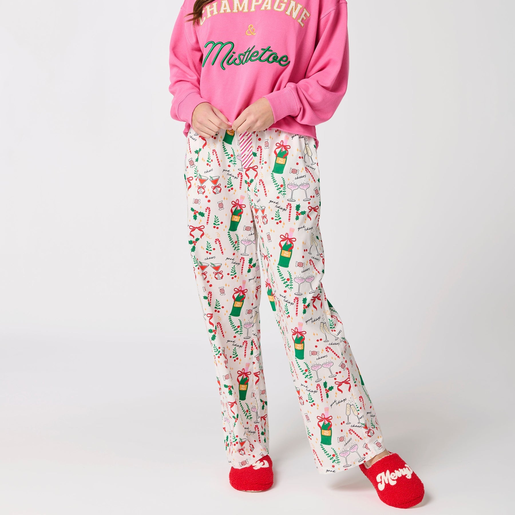 Add some holiday cheer to your loungewear lineup with the Celebration Boxer Pants. These cozy, full-length pajama bottoms feature a festive print of bubbly champagne, candy canes, and mistletoe —all tied together with a pink candy-stripe waistband. With a relaxed fit and 29" inseam, they’re perfect for sipping cocoa or wrapping presents in comfort. Pair them with the coordinating "Champagne & Mistletoe" Lounge Sweatshirt for the ultimate holiday vibe, or mix and match with other pieces in the collection for a look that’s merry and bright. It makes a wonderful holiday gift for girls!