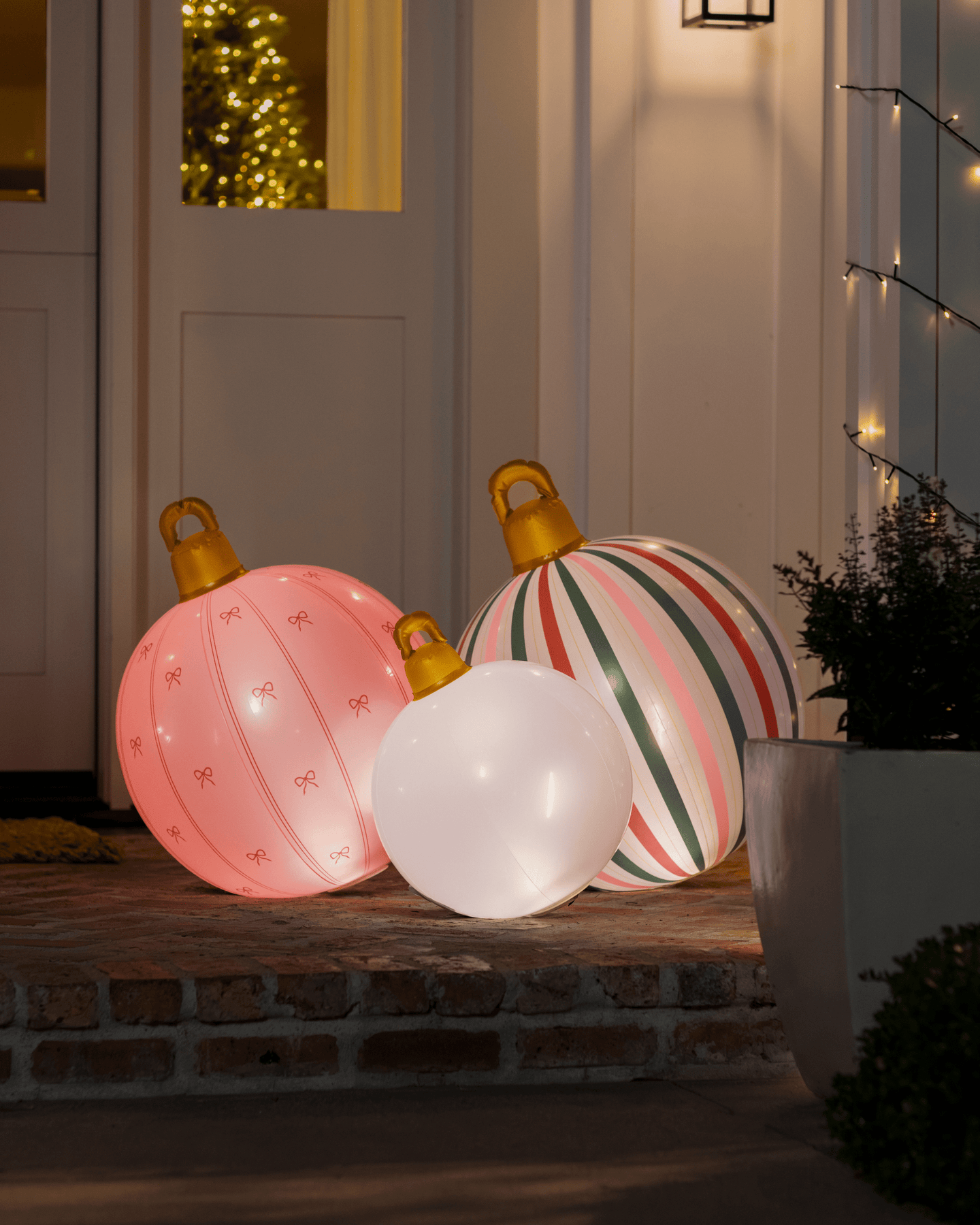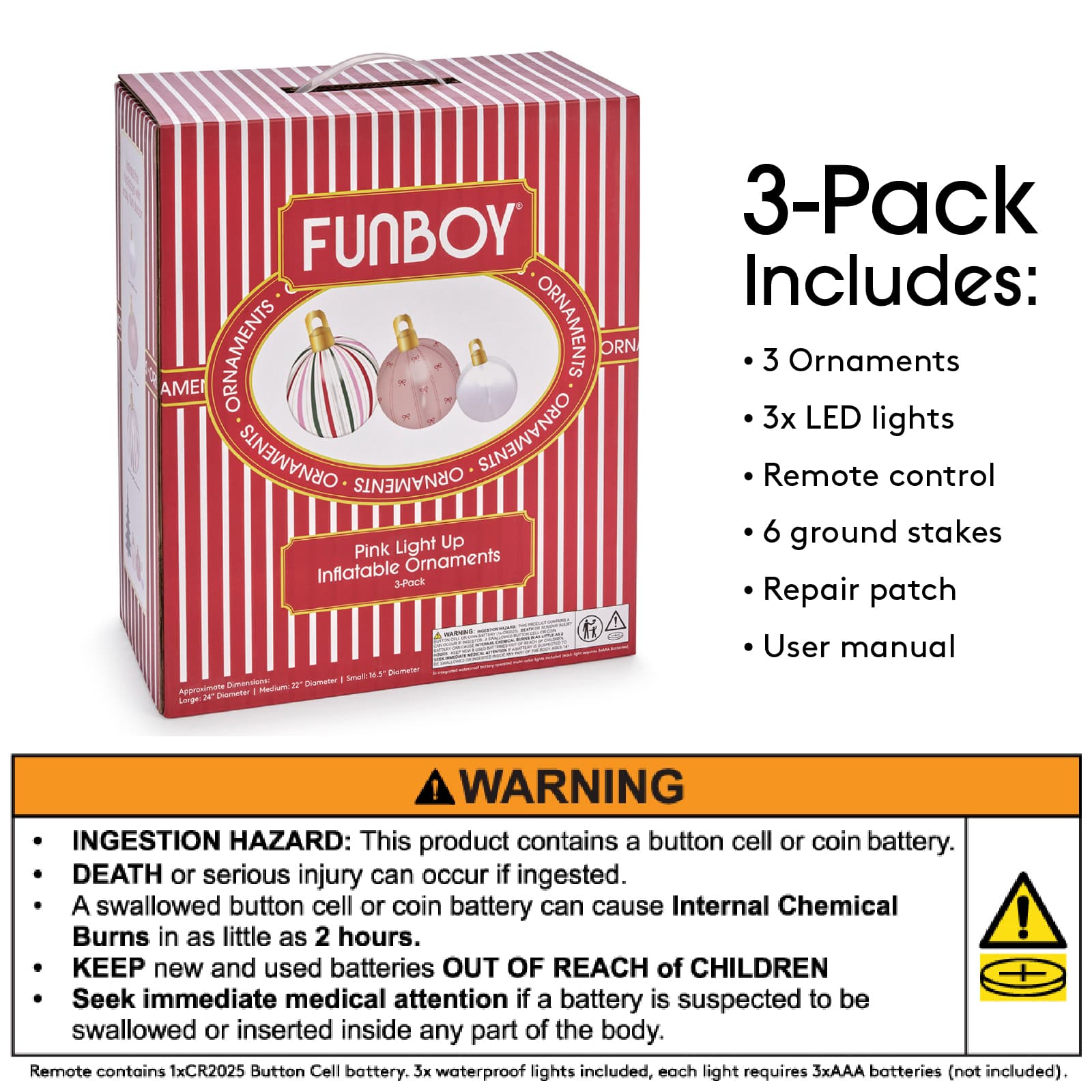 Add a pop of fresh color - introducing pink Christmas decorations. Santa will have no issues finding your house with these oversized light-up Pink Ornaments! Sold as a 3-pack with a Large (24”), Medium (22”), and Small (16.5”), these inflatables are perfect for indoor or outdoor use - they even float! Features include bright battery operated LEDs with 16 different colors and multiple light modes, including a flash and fade party mode. Remote control with timer. Built with a weighted base to stay upright, these ornaments bring a touch of Christmas magic that lasts through the season. The waterproof design allows for fun in the pool or snow! Inflatable and easy to store. Patent pending. Spread the cheer! Each ornament requires 3xAAA batteries (Batteries not included).