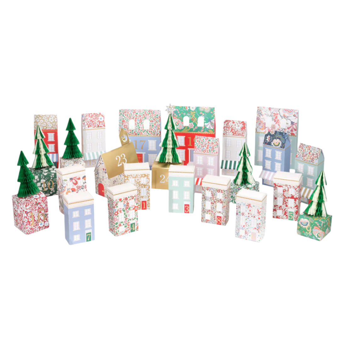 This beautiful Meri Meri x Liberty Advent Village is designed to decorate, delight, and make the countdown to Christmas extra special. This enchanting village of paper box buildings, featuring a joyful mix of Liberty floral and star prints, will create a stunning festive display. Perfect on a table or mantel, or in an unlit fireplace. Extra embellishments make it even more magical, including a little jingling bell in the church tower, honeycomb tissue paper trees and stylish matte gold foil details. Each box is spacious enough to hold your favorite little surprises - think toys, stationery, jewelry, accessories and more. And, you can reuse them year after year, making the tradition even more meaningful for your family.
