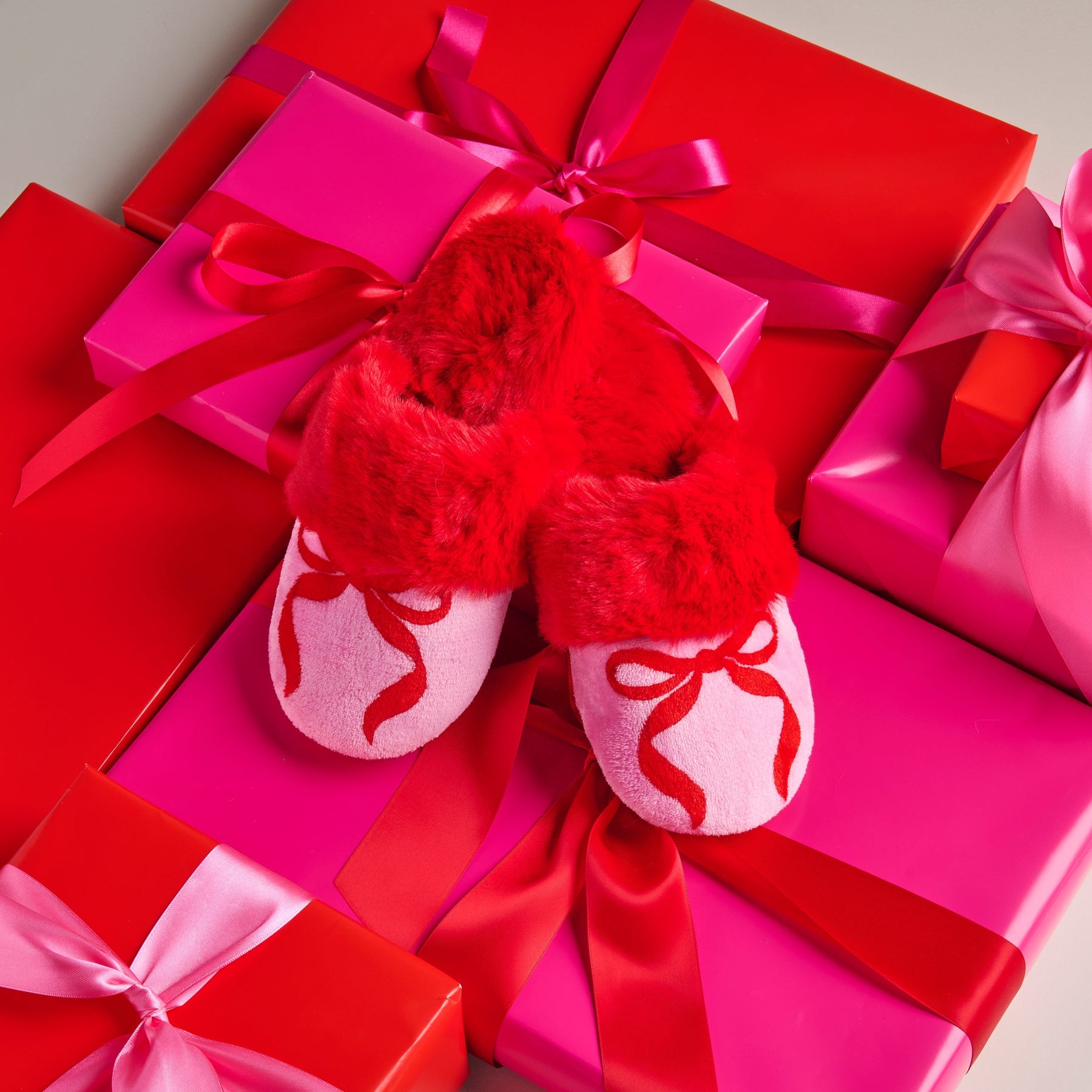 Slip into something sweet with these Pink Bow Slippers, designed to bring charm and cheer to your lounging routine. These cozy slippers feature a playful red bow print on soft pink fabric, trimmed with an ultra-fluffy red faux fur cuff for extra comfort. Whether you're winding down after a long day or enjoying a weekend of relaxation, these slippers add a pop of festive fun to every step. Want to take the look to the next level? Pair them with our coordinating Bow Robe or Bow Bath Wrap for the ultimate cozy-girl moment. They make a wonderful holiday gift for girls!