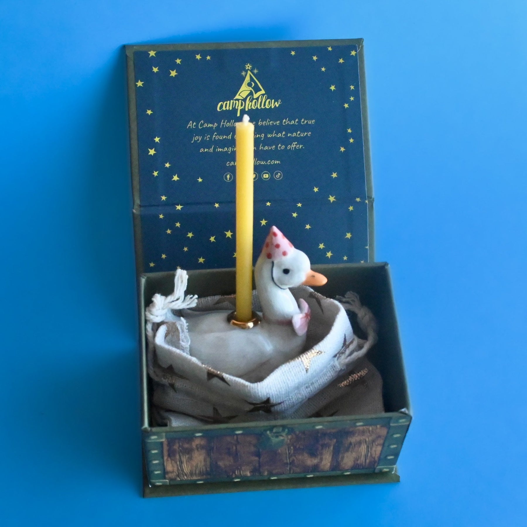 The best party guests come dressed to impress. Clad in a charming pink bowtie and matching cap, this new Pink Goose Birthday Candle Holder by Camp Hollow aims to be the belle of the ball at all of your future celebrations. Brining a touch of whimsy and a ton of cuteness to all of birthday cakes, Easter celebrations, and culinary creations, the Goose Cake Topper is a must-have for kid's parties and grown-up soirees alike. Playfully designed and cheerful in spirit, the Blue Goose Birthday Candle Holder is a surefire way to put a smile on anyone's face. When the candle is lit and the warm glow illuminates the figurine's porcelain features, you'll feel transported to a warm and inviting atmosphere where birthday wishes always come true.