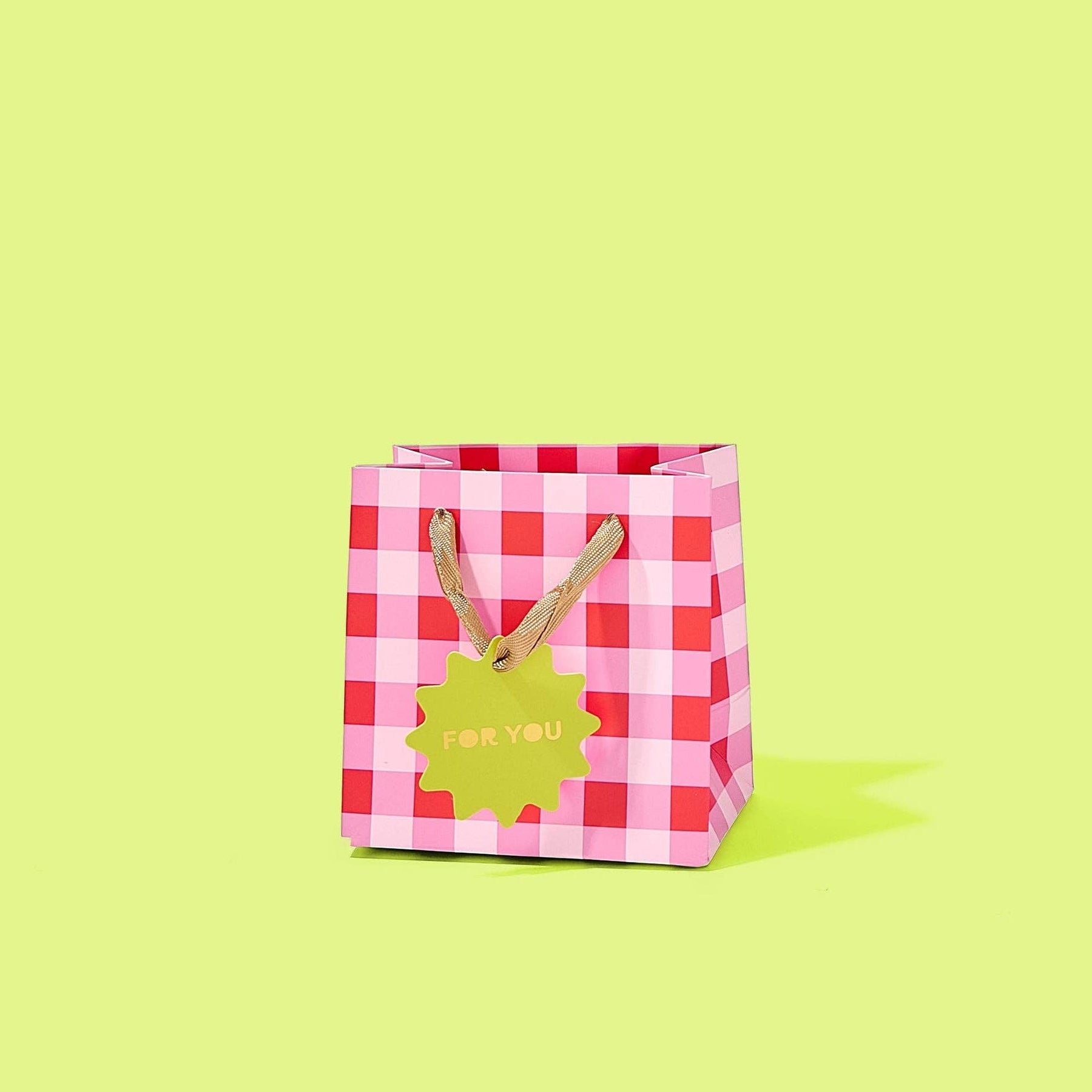Spread love this Valentine's Day with this charming Red & Pink Gingham Gift Bag. This delightful design features a classic gingham pattern in romantic red and pink tones, perfect for presenting your most meaningful gifts. The sturdy gold ribbon handle adds an elegant touch, while the included green tag lets you personalize your message. Whether you're gifting chocolates, jewelry, or heartfelt surprises, this gingham bag transforms any present into a thoughtfully wrapped treasure that shows you care about every detail.