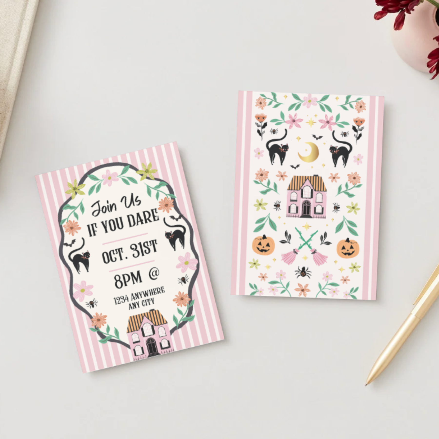 Start your Halloween celebration with our customizable Pink Haunted House Cottagecore Digital Party Invitation! Perfect for any Halloween event, this listing includes one editable template that features a stylish pink and black palette, showcasing an adorable pink haunted house and an elegant black cat.