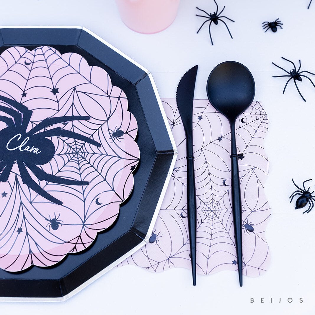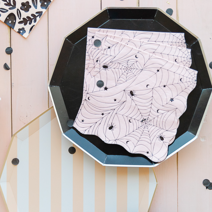 Get ready to wow your guests with our Spiderweb Lace Pink Napkin. It's spookily stylish and perfect for pink-themed Halloween parties! The delicate lace webs, moons, stars, and spiders add just the right amount of eerie elegance.