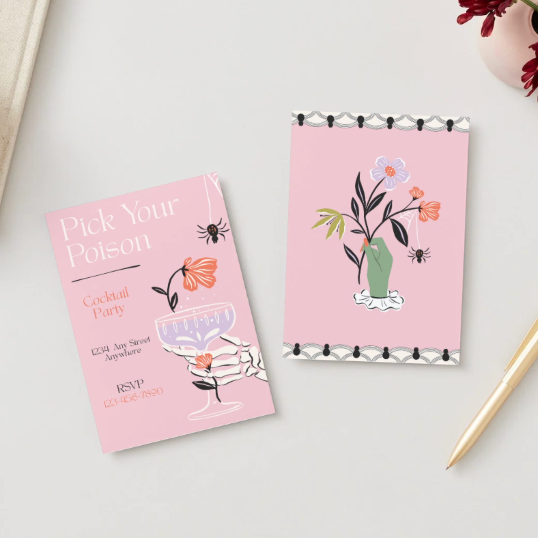 Start your Halloween celebration with our customizable Pick Your Poison Digital Party Invitation! Perfect for any Halloween event, this listing includes one editable template that features an elegant pink design highlighted by a stunning skeleton hand holding a cocktail, perfect for setting a stylish and memorable tone!