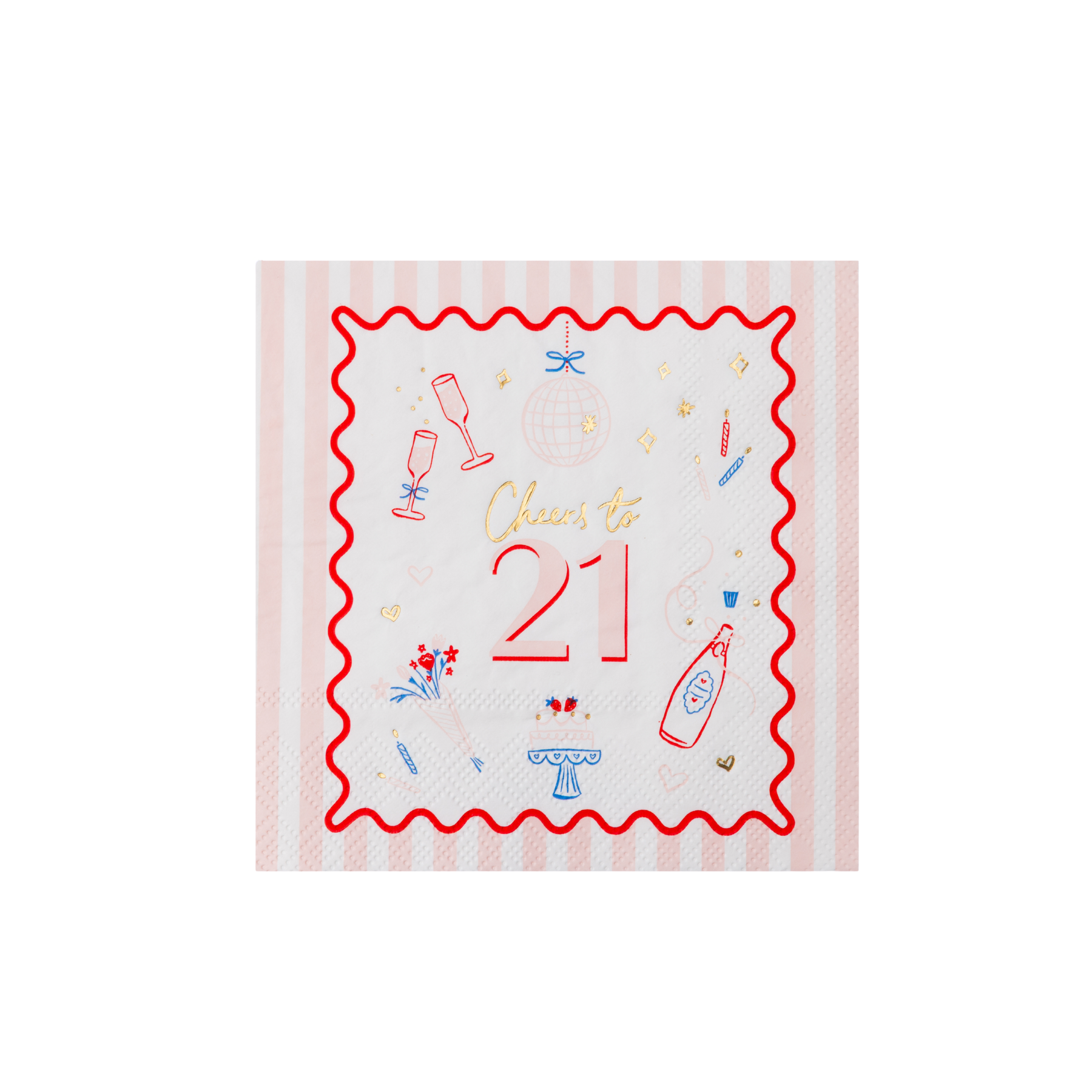 Elevate your milestone celebration with our Cheers To 21 Icon Cocktail Napkins. Featuring a pink striped pattern with playful illustrations, these premium paper napkins transform an ordinary table into a curated experience. Perfect for any 21st birthday party, pair them with our Birthday Cake Small Plates to create a charming tablescape. Whether draped beside place settings or displayed at the dessert table, these napkins deliver the premium finishing touch that the birthday girl will love!
