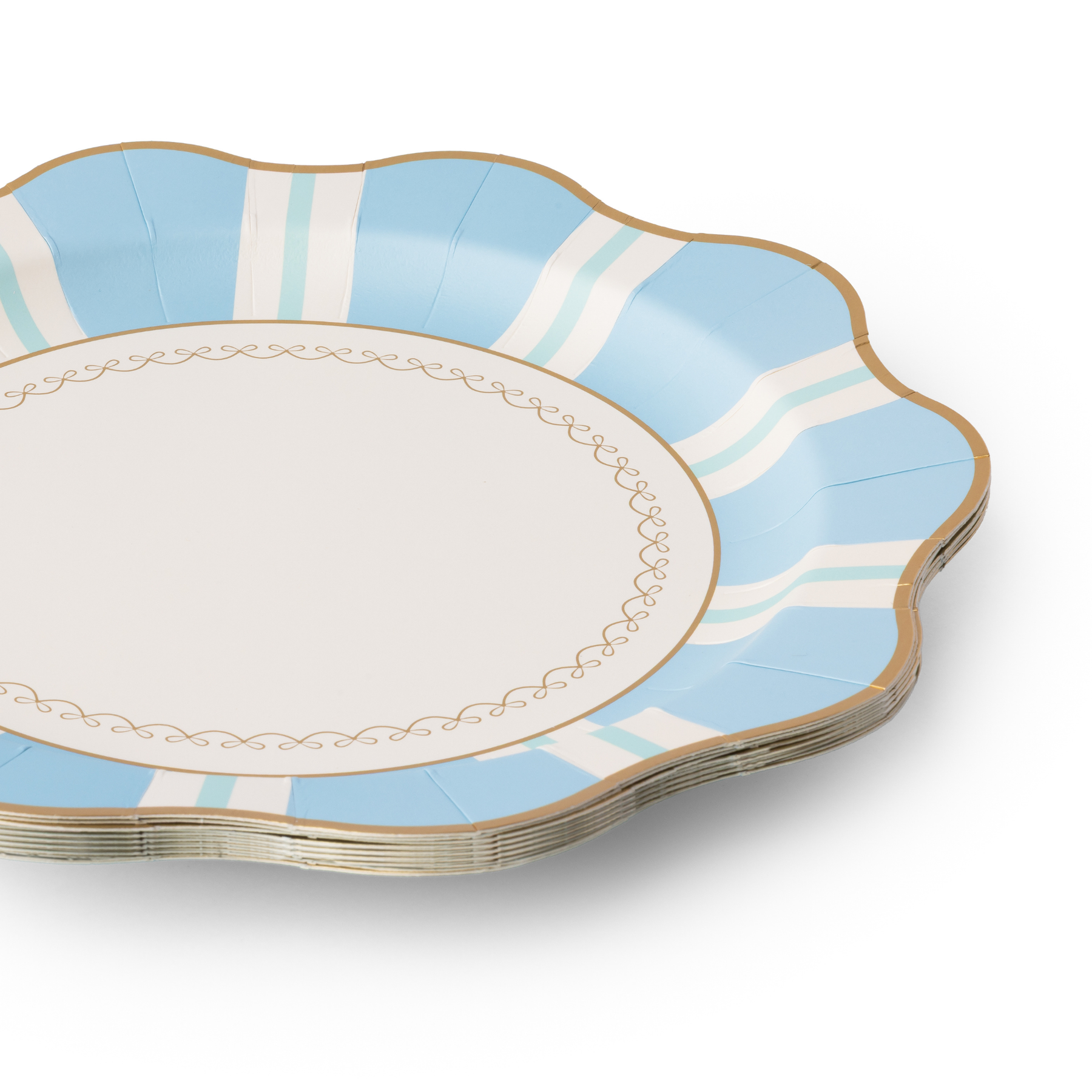 Add a touch of regal sophistication to your tablescape with our Sky Blue Regency Stripe Dinner Plates! Featuring gold foil bows and a blue and mint striped trim, these large plates can be layered on your tablescape with our French Crème Eco Large Napkins to create an elegant presentation.