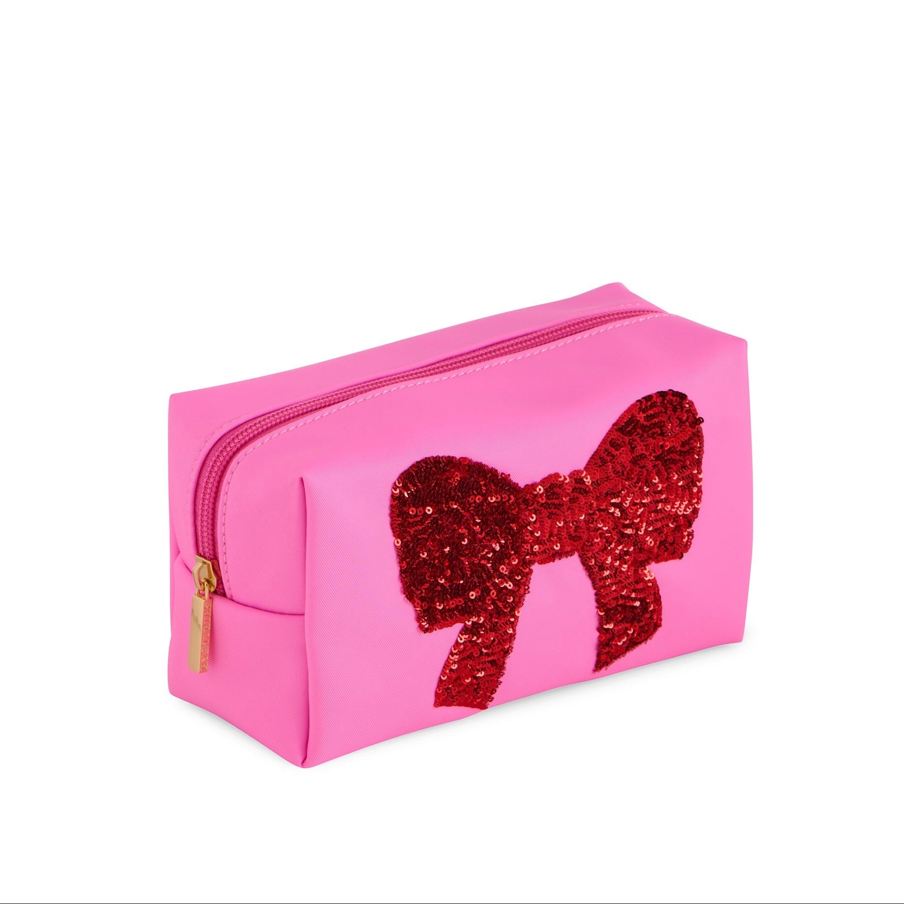 Meet your new favorite cosmetic pouch: the Cara Sequin Bow Pouch! This bright pink beauty is topped with a bold red sequin bow that adds sparkle and sass in all the right ways. Its structured shape and roomy interior make it perfect for stashing makeup, pencils, or everyday must-haves. Finished with a sleek zipper and gold hardware, it’s equal parts cute and functional.