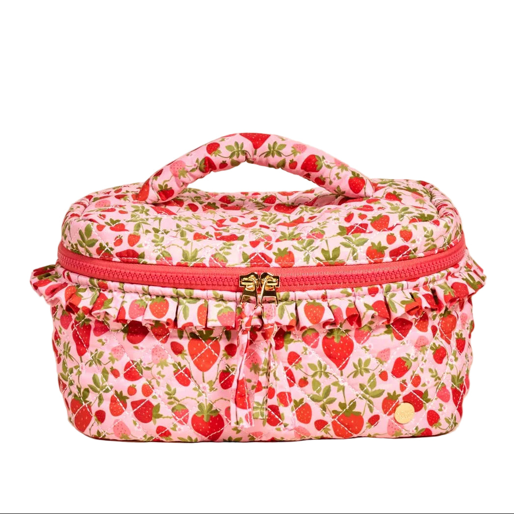 Simplify your beauty routine with this Strawberry Quilted Cosmetic Bag. Crafted from soft, quilted fabric and equipped with a convenient handle, this bag features an all-around gold double zipper for easy access. This bag features an interior lining that is wipeable and water-resistant—keeping everything easy-to-clean and tidy. It's perfectly sized to carry your must-haves, whether you're traveling, running errands, or just need a stylish way to keep your essentials in place.