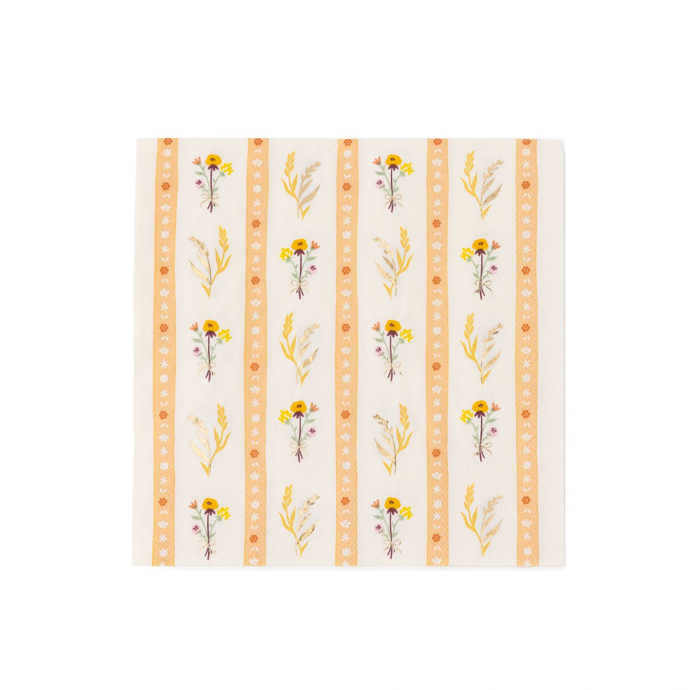 Let our Cozy Fall Florals Large Napkins bring a touch of vintage charm to your table with its sweet floral and stripe design. The warm tones and shiny gold foil accents create an autumnal and chic feel that will elevate any fall gathering, including Thanksgiving dinner.