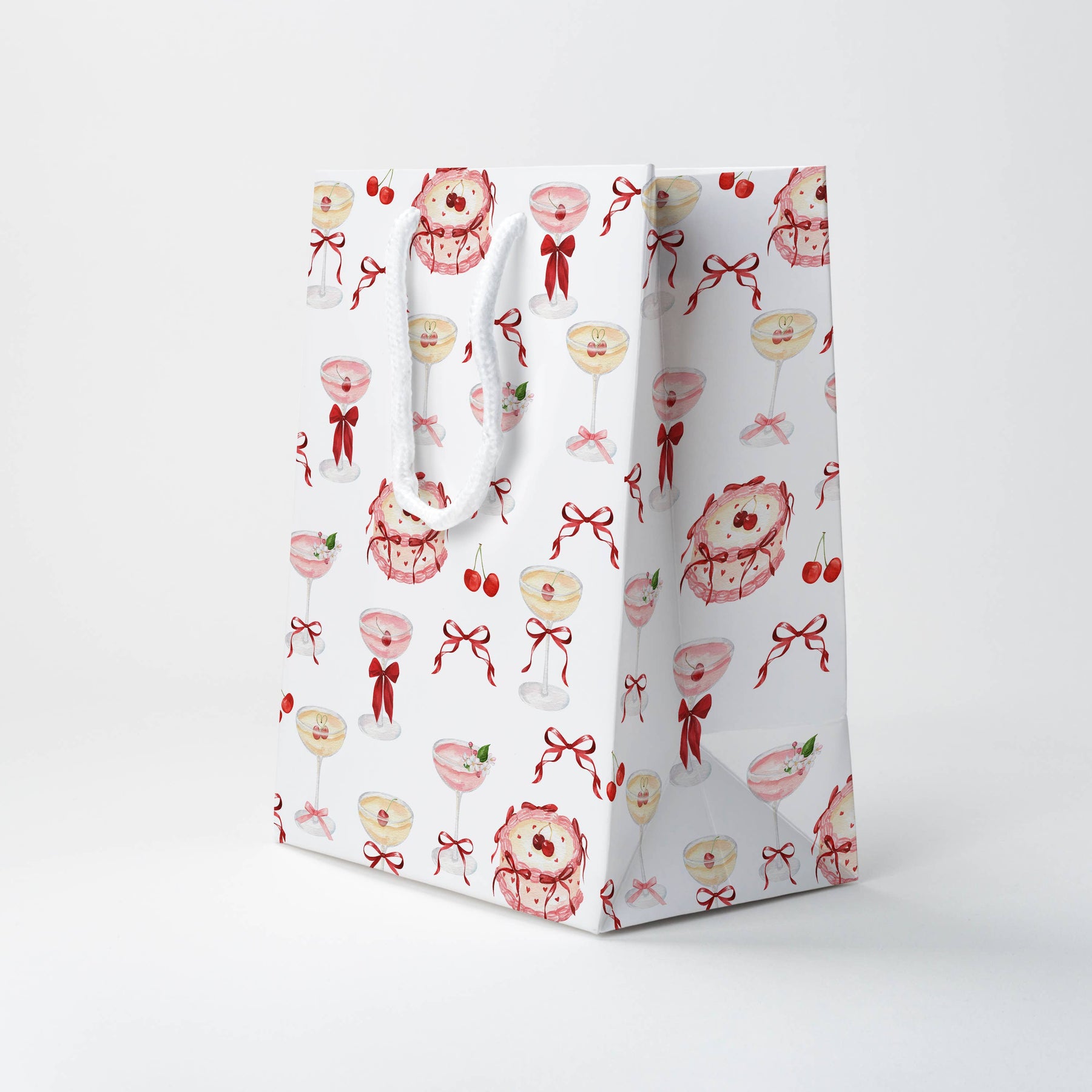 Make every gift unforgettable with this delightful Whimsical Cocktails & Cake Gift Bag, perfectly blending sophistication and playfulness. It features charming illustrations of cocktails and cakes in romantic pink tones, accented with striking red bows, delightful cherries, and sweet hearts. This gift bag is ideal for Valentine's Day, bridal showers, and everyday celebrations.