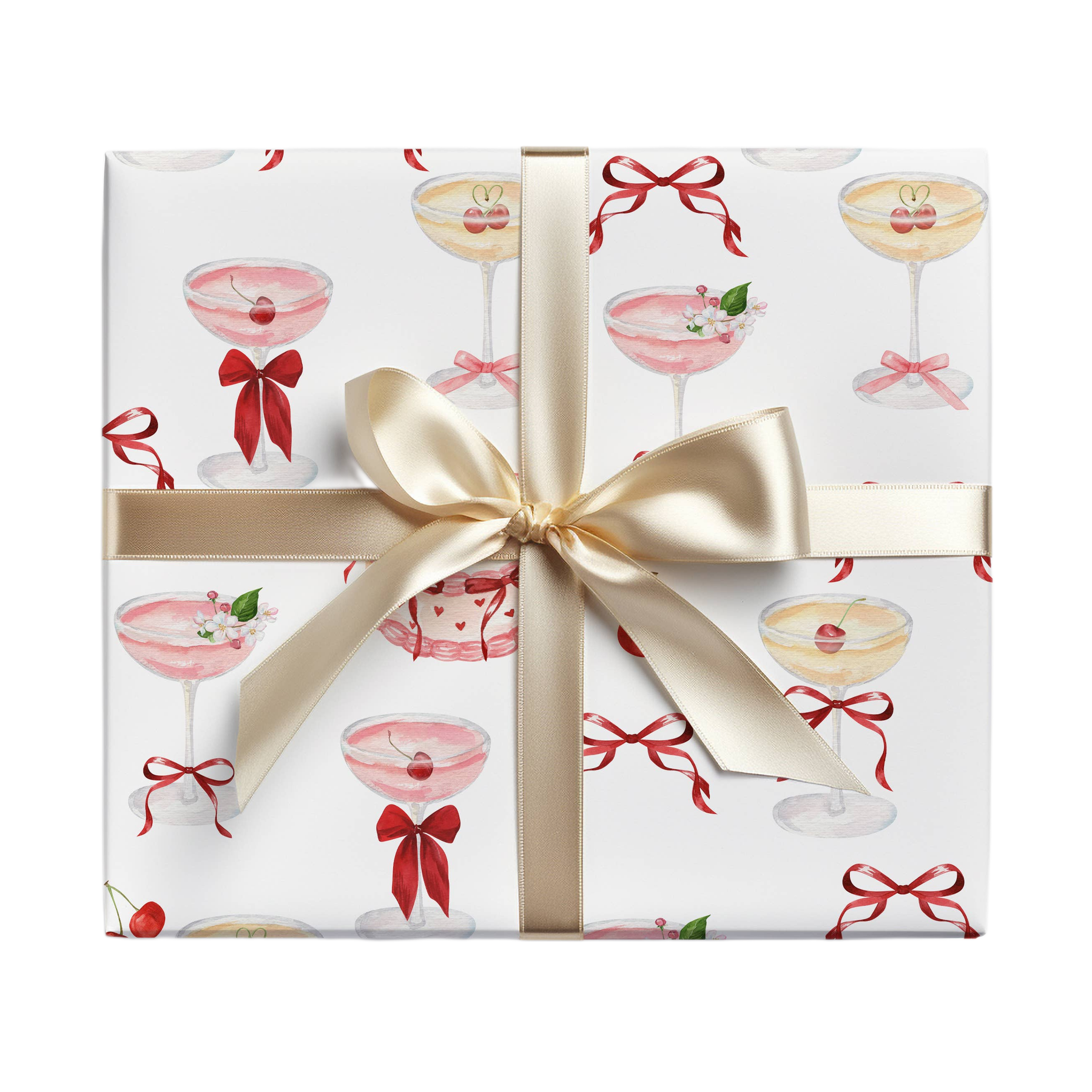 Make every gift unforgettable with this delightful Whimsical Cocktails & Cake Gift Wrap Sheets, perfectly blending sophistication and playfulness. It features charming illustrations of cocktails and cakes in romantic pink tones, accented with striking red bows, delightful cherries, and sweet hearts. This wrapping paper is ideal for Valentine's Day, bridal showers, and everyday celebrations.