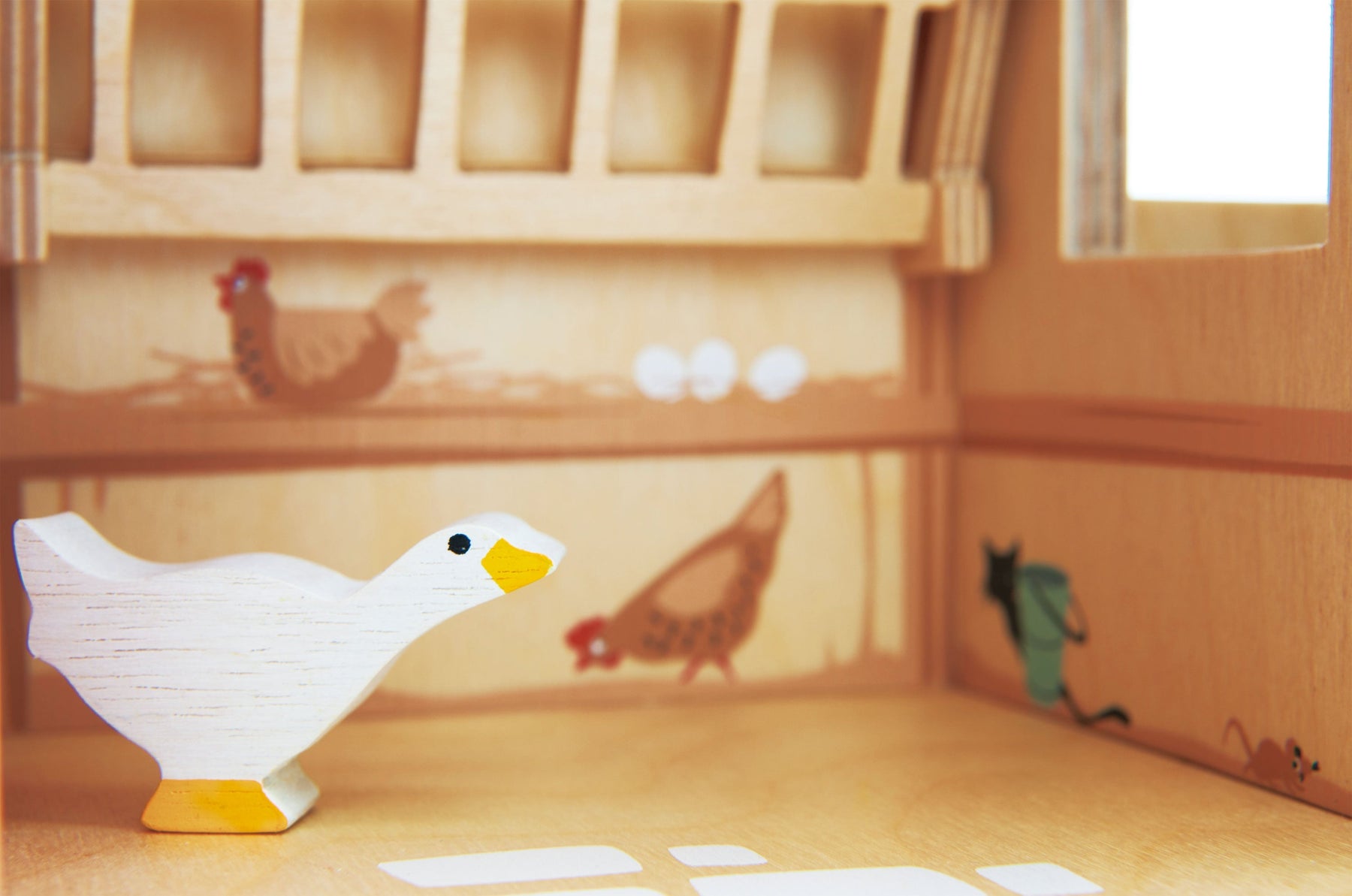 Made throughout from top quality plywood, this farm has been designed to be open and accessible for little hands. It features a barn with barn doors and a feeding trough, 2 stables with opening doors, a ladder leading to hay loft, a pulley system with a magnetic end to lift the hay bales, a cowshed with feeding compartments, four fences, a stile, three hay bales, 2 geese, 2 horses, a grain trough, an animal feeding trough, a beehive and 6 logs.