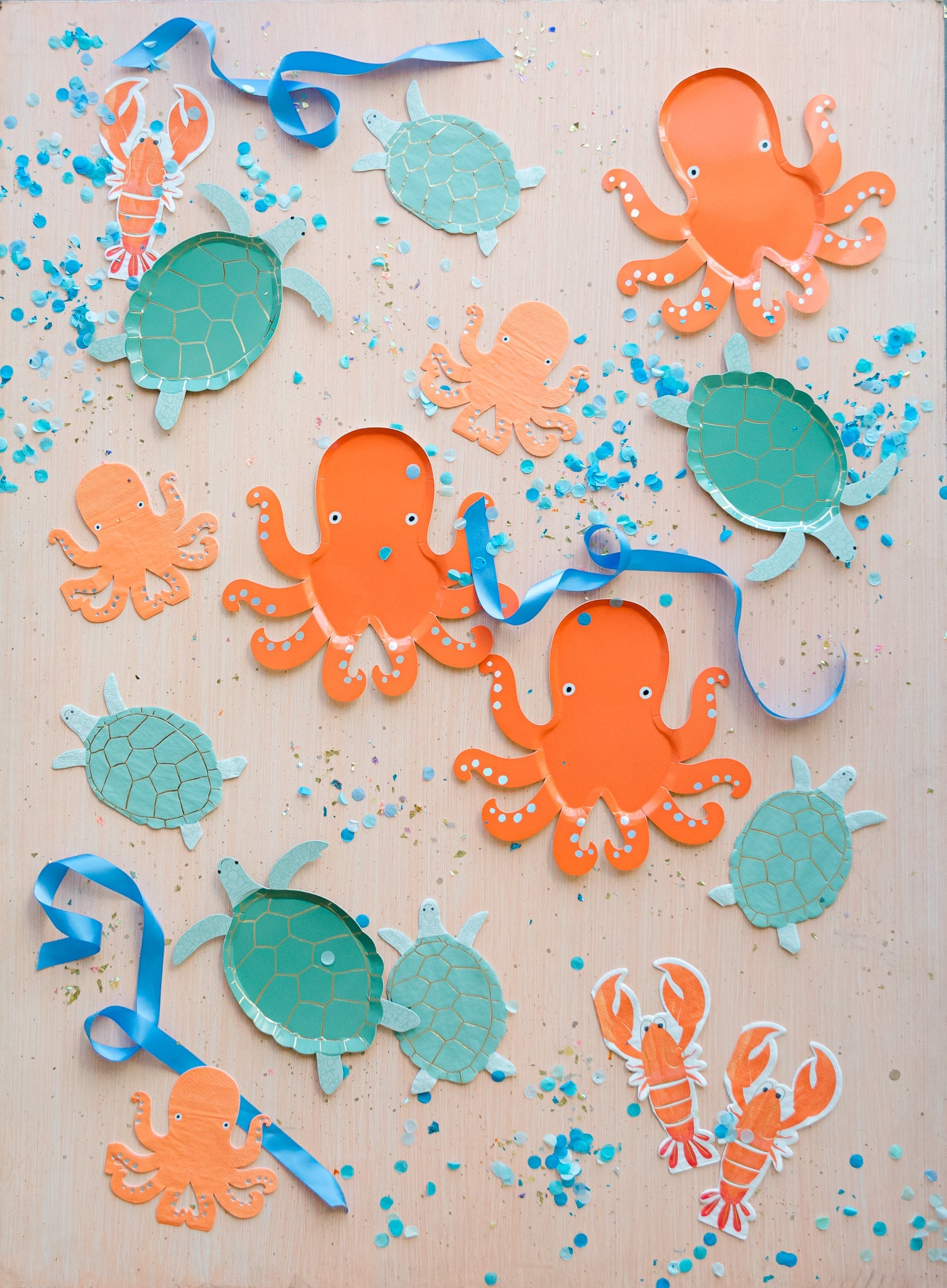 Explore Bonjour Fête’s tropical trove of under-the-sea party ideas and under-the-sea party decorations–perfect for any ocean-themed occasion! Create an underwater paradise with our range of blue backdrops, fish decorations, and other ocean-inspired party supplies. Add some so-fish-stication with sea animal decorations like our giant shark balloon! Serve octopus cupcakes, jelly fish sandwiches, and salty sea party food on tableware featuring sand dollars and adorable sea creatures. If you’re planning an under the sea birthday party, stock up on birthday cake toppers and fin-tastic favors. From summer pool parties to mermaid birthday parties, you’ll find all of the sea life essentials and birthday party ideas at Bonjour Fête!