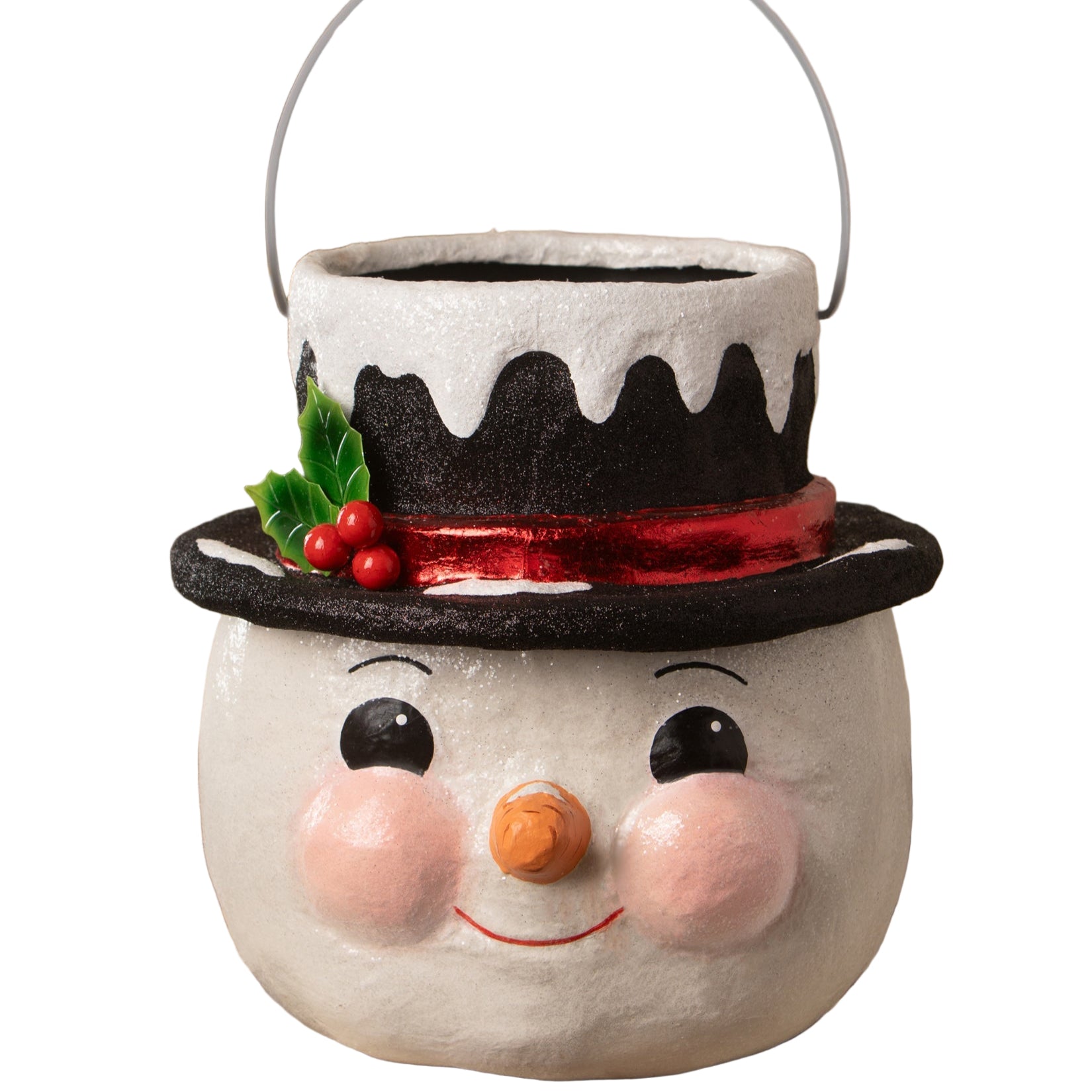 Bring home the Bethany Lowe Holly Hat Snowman - Large, a charming paper mâché character full of holiday spirit. Sporting a black top hat dusted with glittery “snow,” a shiny red metallic band, lacquered holly leaves, and bright red berries, he’s ready to brighten your festivities. His carrot nose and wire handle add whimsy and ease, while the hat’s opening lets you tuck in faux evergreens, berries, or flowers to personalize his style. Perfect for sprucing up your table, centerpiece, or mantel with a playful holiday touch.