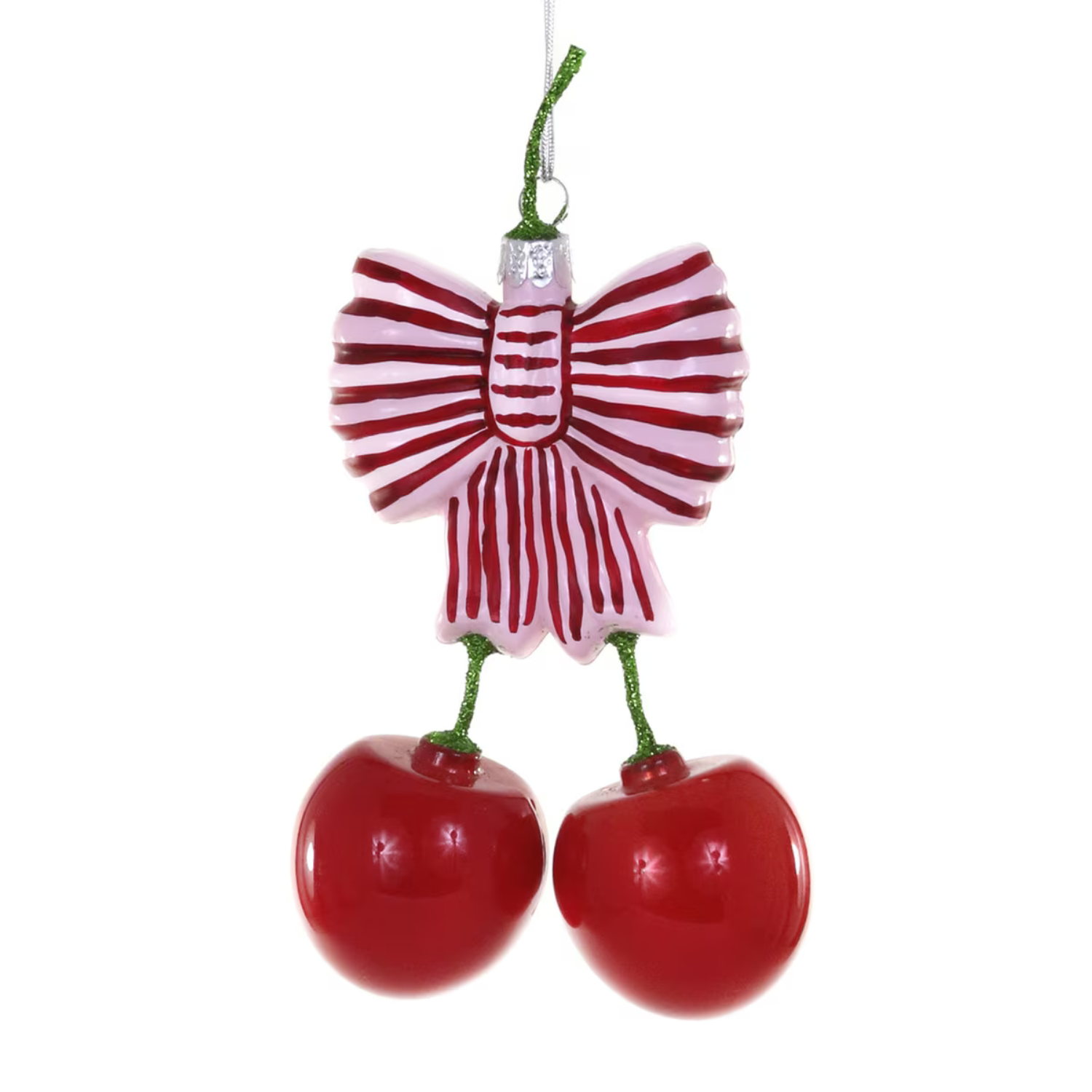 Add charm to your Christmas tree with this Bow and Cherries Glass Ornament by Cody Foster. Featuring a cute red striped bow and two cherries, it's the perfect accessory to bring a charming and festive feel to your holiday decorations.