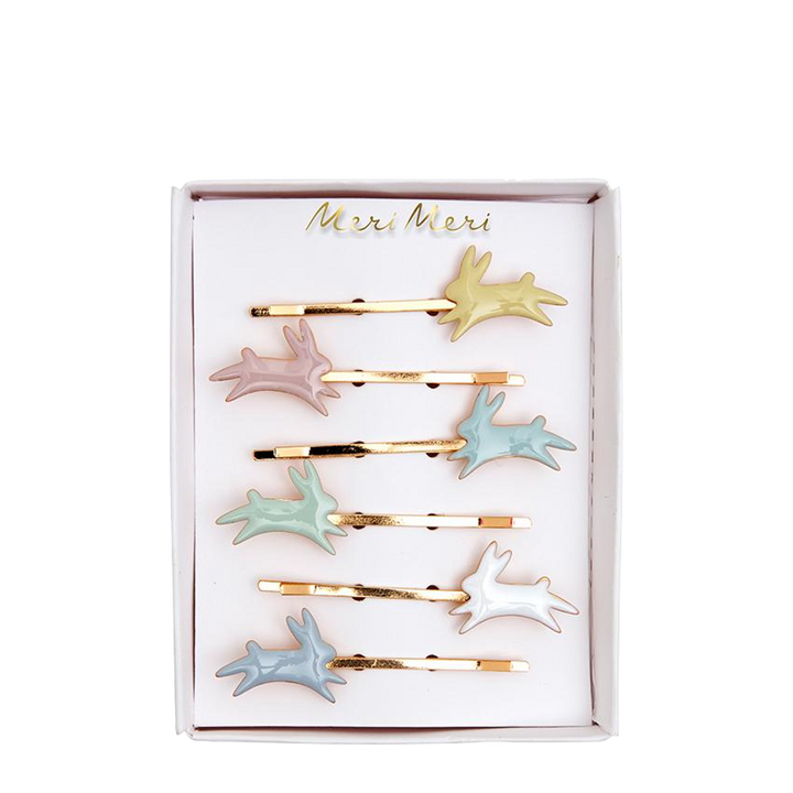 Complete any springtime hairstyle with these charming bunny hair pins! These girls' hair accessories are crafted out of pastel-colored enamel, and feature gold-toned clips that easily slide. The perfect Easter party accessory or springtime gift for an Easter basket!