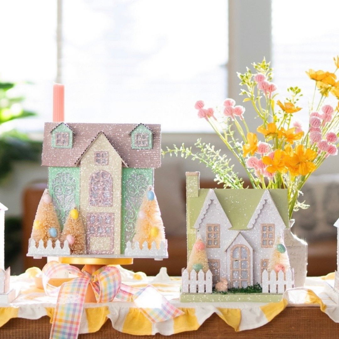 Bring a touch of spring to your home with this Pastel Spring House! Its charming shades of pink, blue, and cream make for a perfect addition to your Easter home decor. Create your own Easter village with this delightful piece.