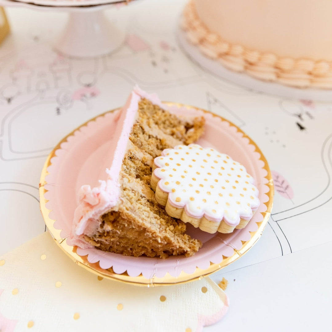 These perfectly pink Princess Crown Plates are fit for royalty with a gold foil crown accent and foil edging. These plates are wonderful for serving birthday cake and cupcakes or dainty finger foods served at your kid's princess party, especially when paired with princess birthday party decorations! See the styled images for more princess birthday party ideas!